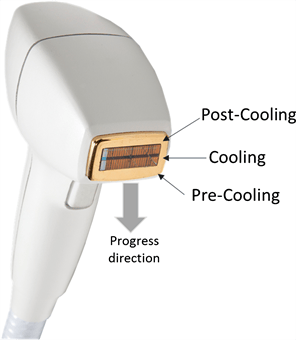 The sapphire light guide is located at the front of the handpiece and delivers the laser beam energy to the treated tissue, while cooling the skin. The sapphire block is surrounded by a chilled gold-plated metal frame. This structure provides increased cooling to a temperature of about 7˚C on the treatment spot and a few millimeters around it. The handpiece cooling flow is demonstrated in Figure 3. The arrow indicates the tip progress direction on the skin. One part of the metal frame is responsible for pre-cooling, the sapphire light guide is responsible for the cooling stage and the other part of the metal frame is responsible for post-cooling during handpiece progression.