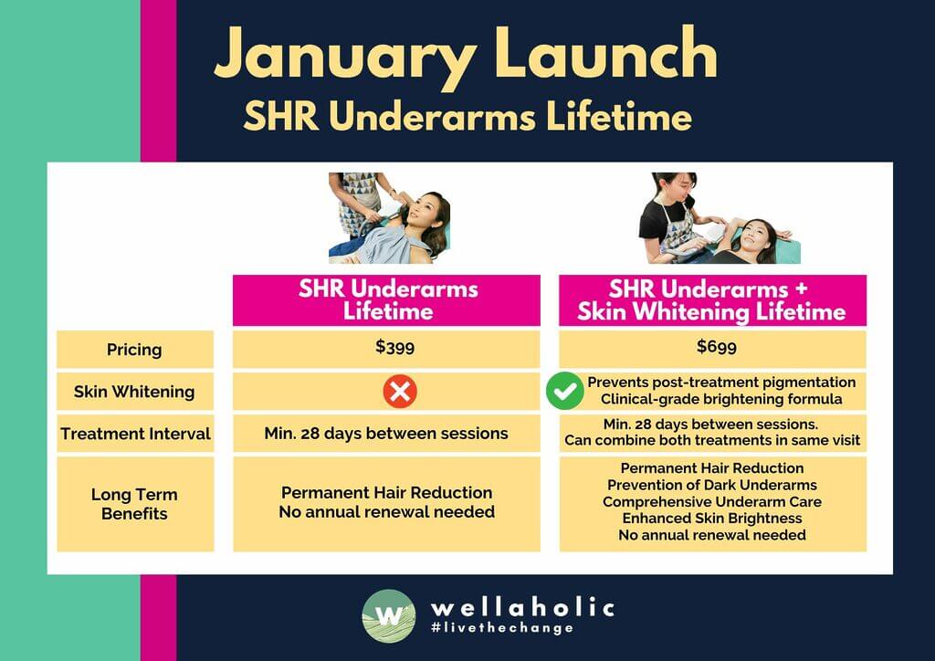 在 Wellaholic,我们正在通过两项突破性的终身配套,彻底改变腋下护理体验,让您无需每年续费。我们的**SHR 腋下无限制终身配套($399)**提供永久使用我们屡获殊荣的脱毛护理,而我们的 **SHR 腋下脱毛 + 美白无限制终身配套($699)**则结合了脱毛和先进的嫩肤亮白技术。通过我们在新加坡各分店为数千名顾客提供的服务,我们已经见证了这种综合方法如何带来卓越的长期效果。